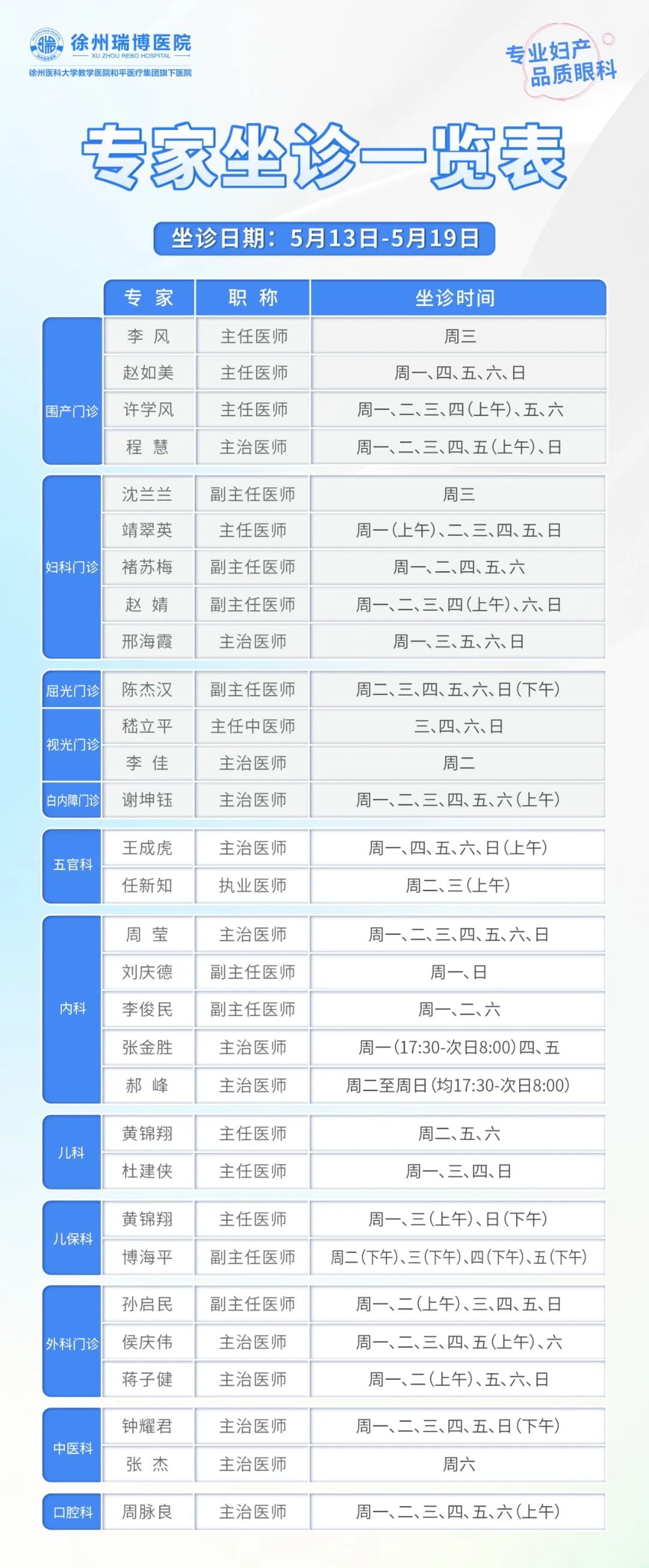 瑞博医院2024年5月13日-5月19日专家坐诊时间表,请查收!